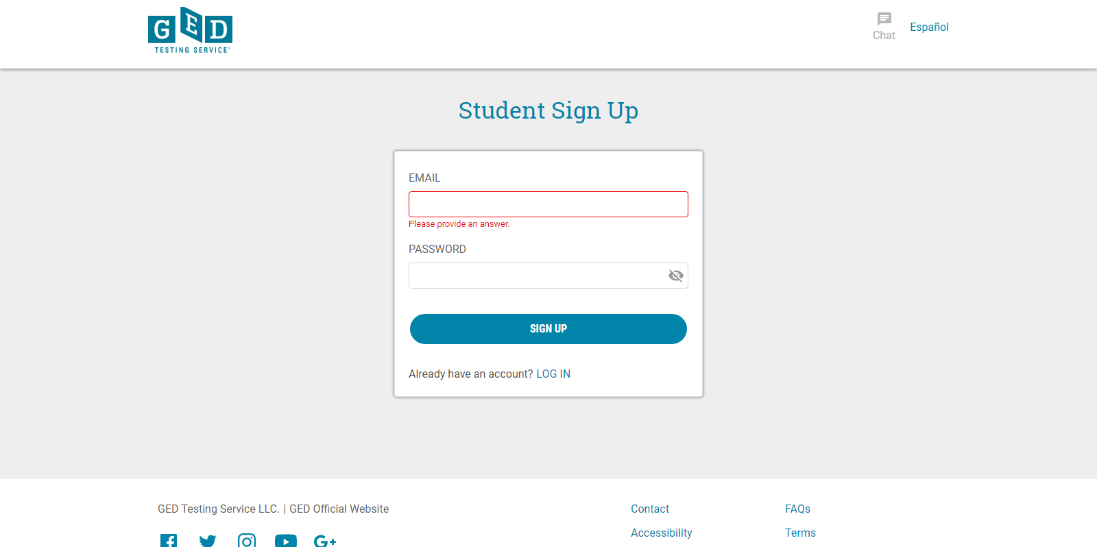 웹브라우저를 통해 GED 공식 사이트(https://ged.com/)에 접속하신 후, 오른쪽 상단의 "Sign Up" 버튼을 통해 회원가입을 하십시오.