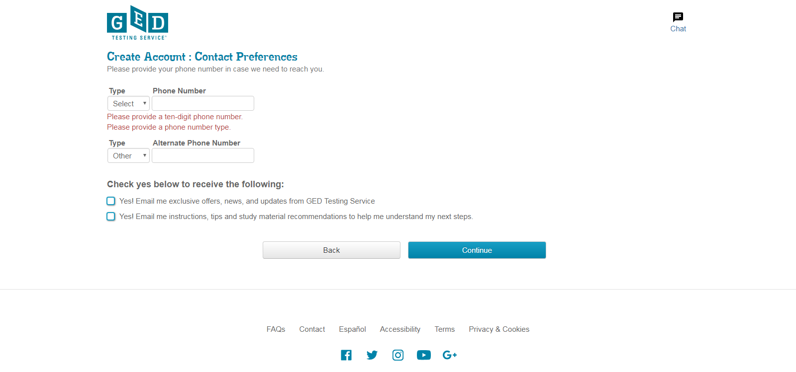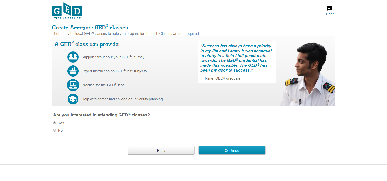 GED classes 회원 계정 생성 여부를 선택 후 "Continue" 버튼을 클릭합니다.