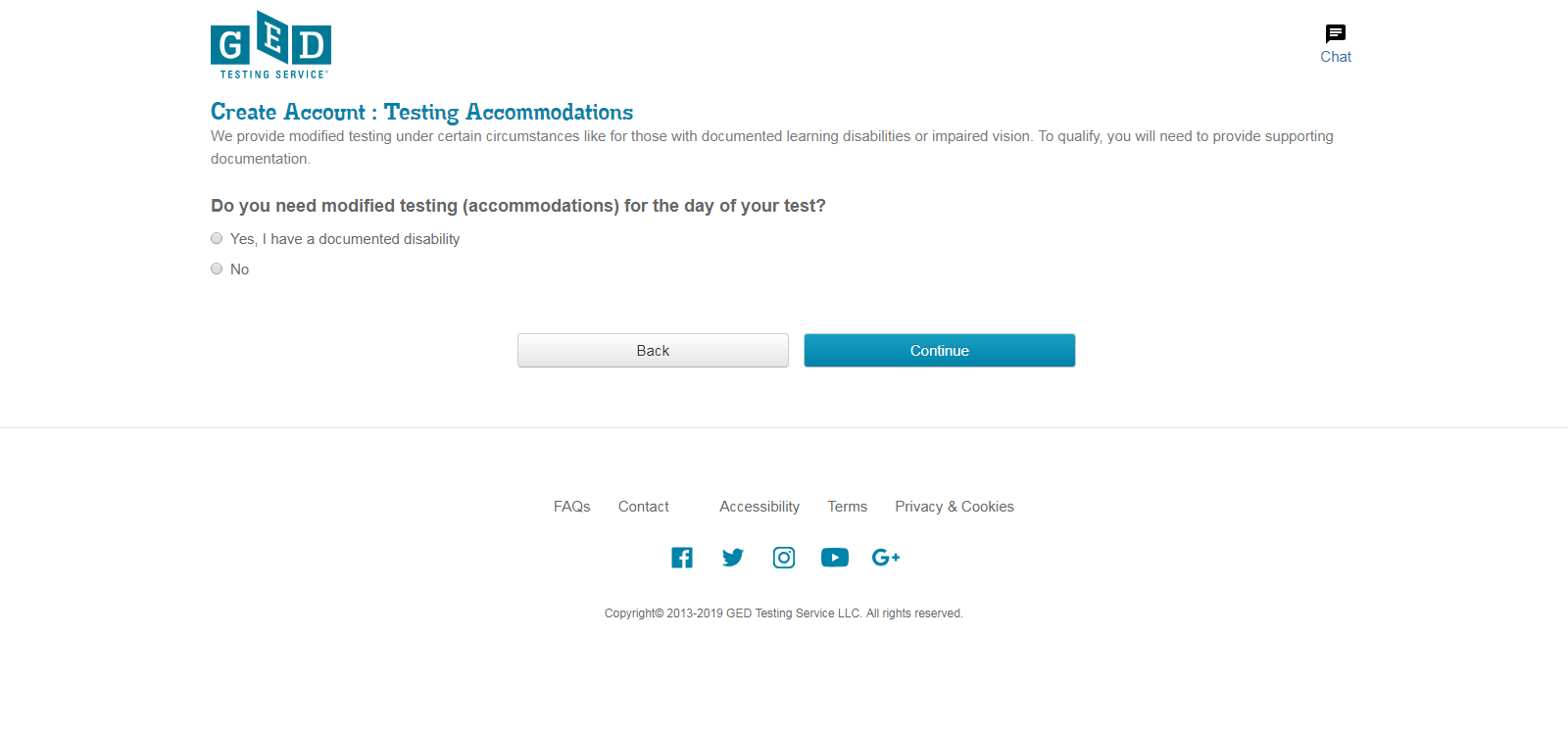 시험 편의시설 계정 생성 여부를 선택 후 "Continue" 버튼을 클릭합니다.